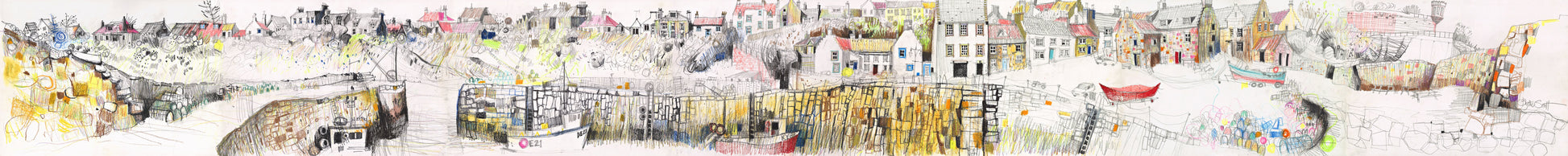 This series of panoramic prints have been developed from enormous sketches that were created in the East Neuk of Fife. The original drawings are up to 6 metres long but all of the prints have been reduced to a length of 120 cm plus borders. Image heights will vary slightly according to the design chosen. They are printed on the best quality smooth, 310 gsm Hahnemuhle etching paper. They can be hung singly, stacked above a bed or sofa or perhaps side by side along a hallway. The prints are open edition and hand stamped and signed by the artist.