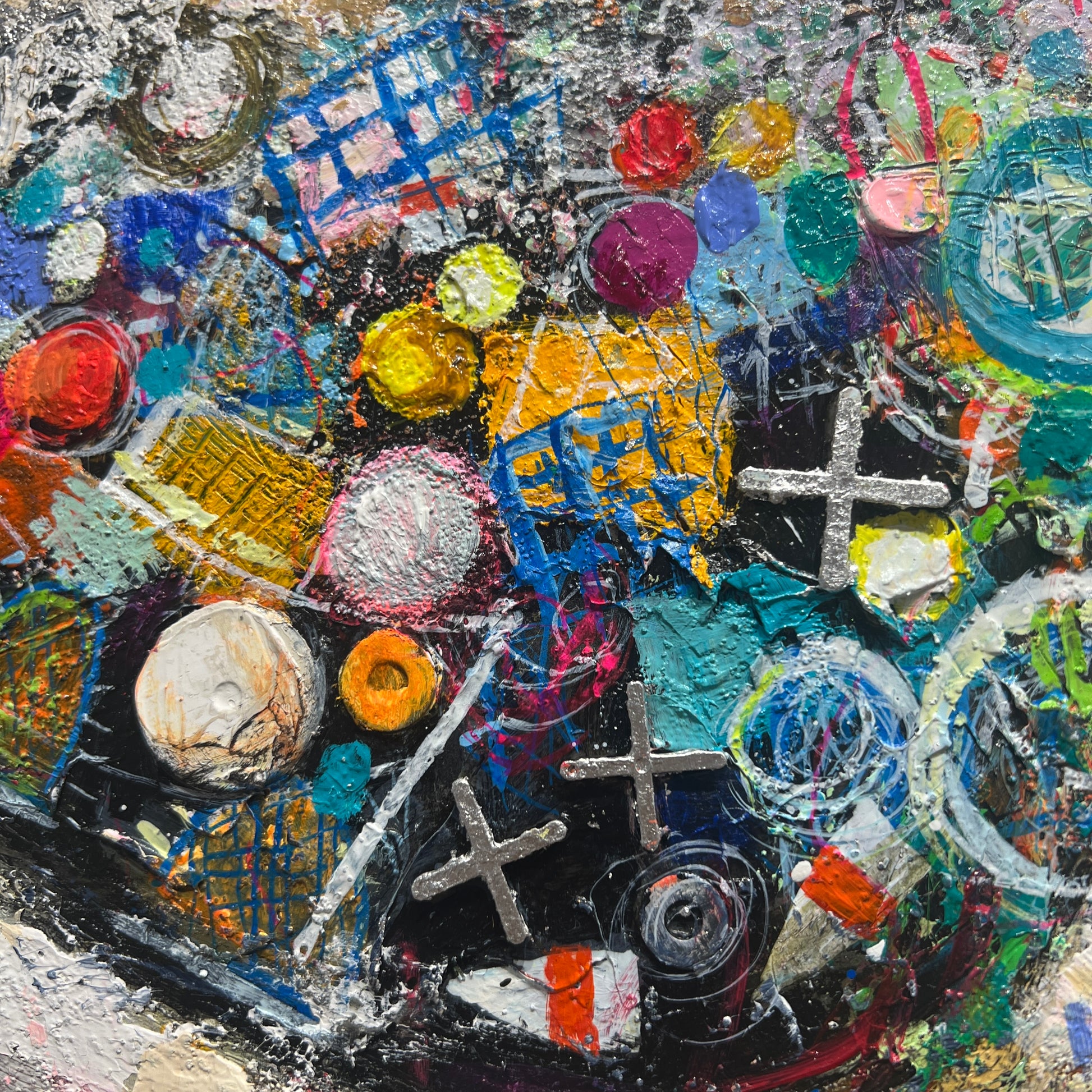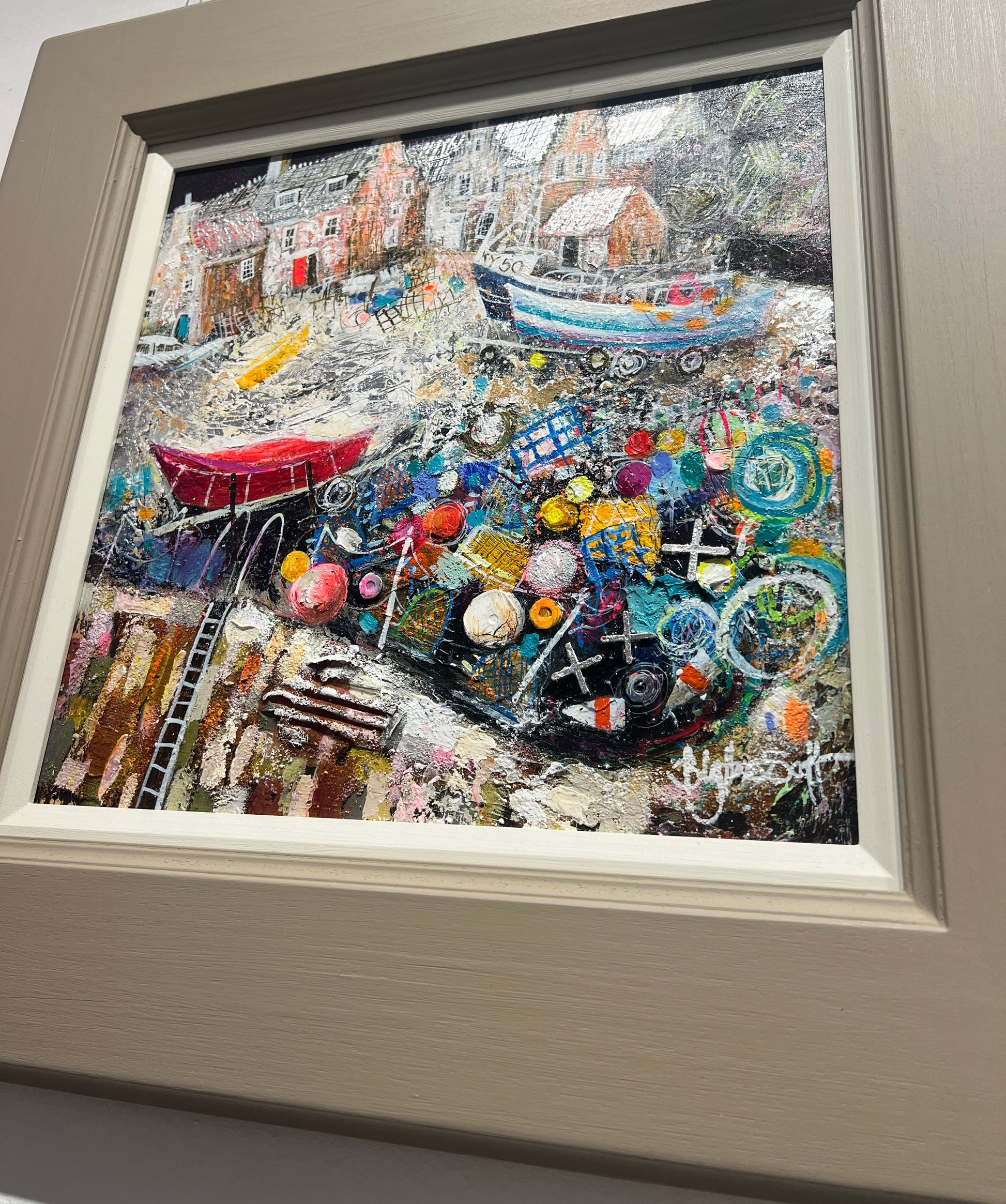 This quirky night scene depicts Crail Harbour by moonlight. The overnight frost twinkles on the rooftiles that are picked out in silver metal leaf. The artwork has been created with mixed media, collage and texture on a 14" x 14" board. It is presented in a solid wood painted and waxed greyish beige frame with a contrasting ivory slip. The framed dimensions are 22'' x 22''.