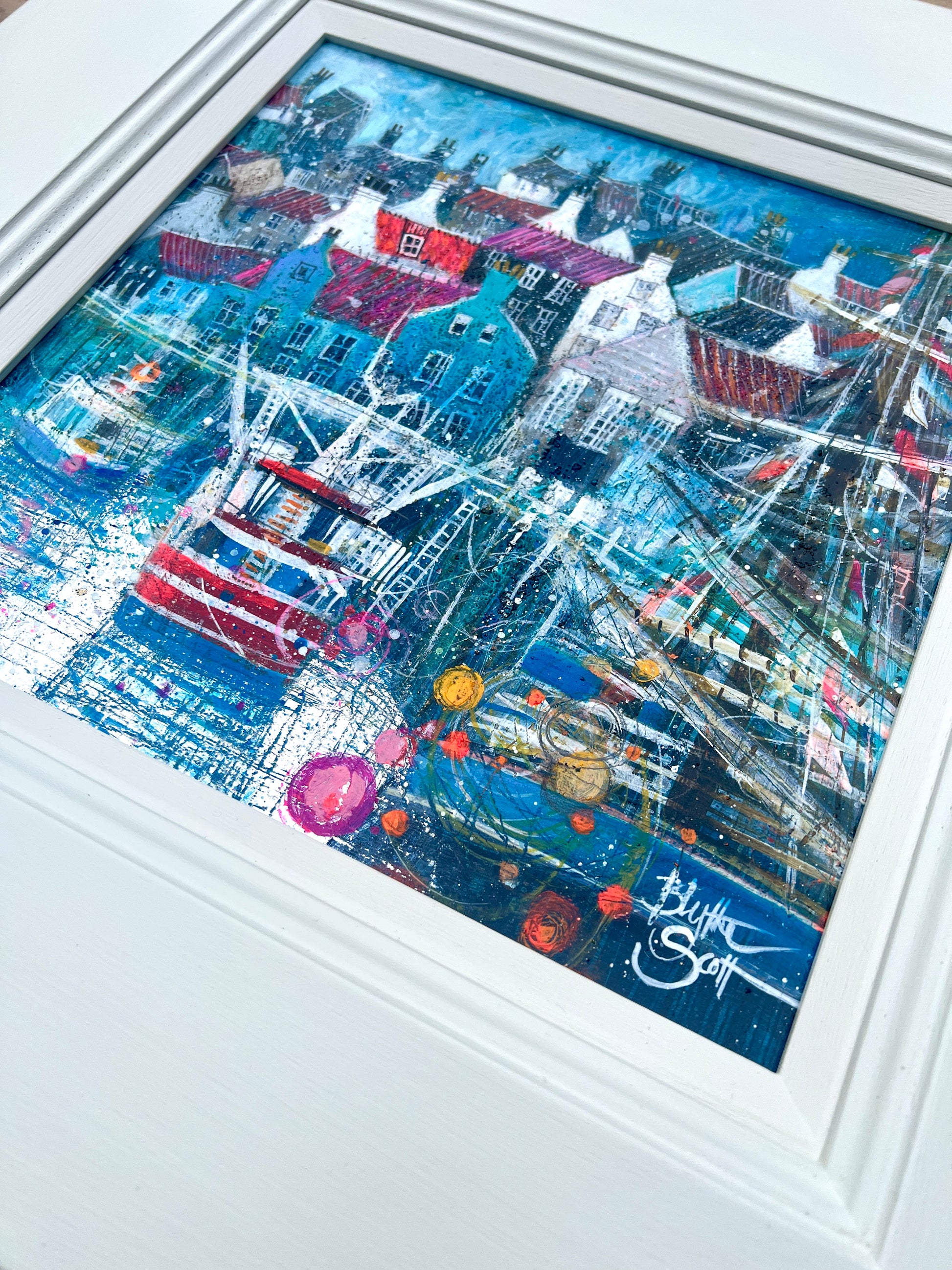 This lively small scale painting was inspired by the busy harbour at Whitby in the North of England. It has been created on board using mixed media and silver metal leaf. The image measures 30 x 30 cm and it is presented in a painted and hand waxed solid wood frame with slip, measuring 49 x 49 cm.