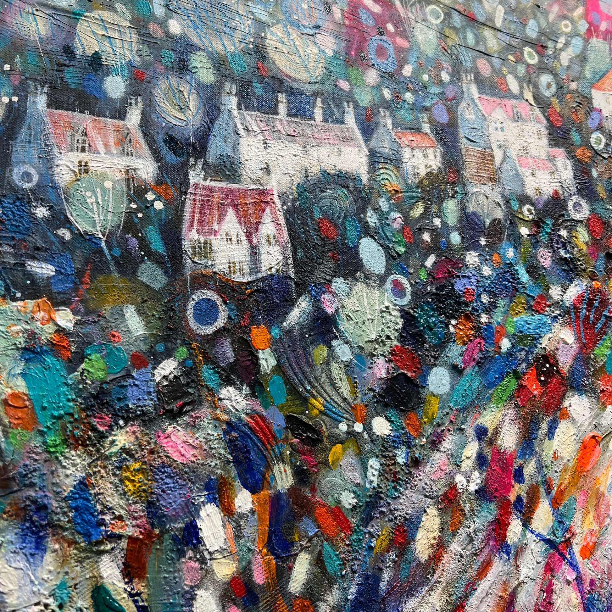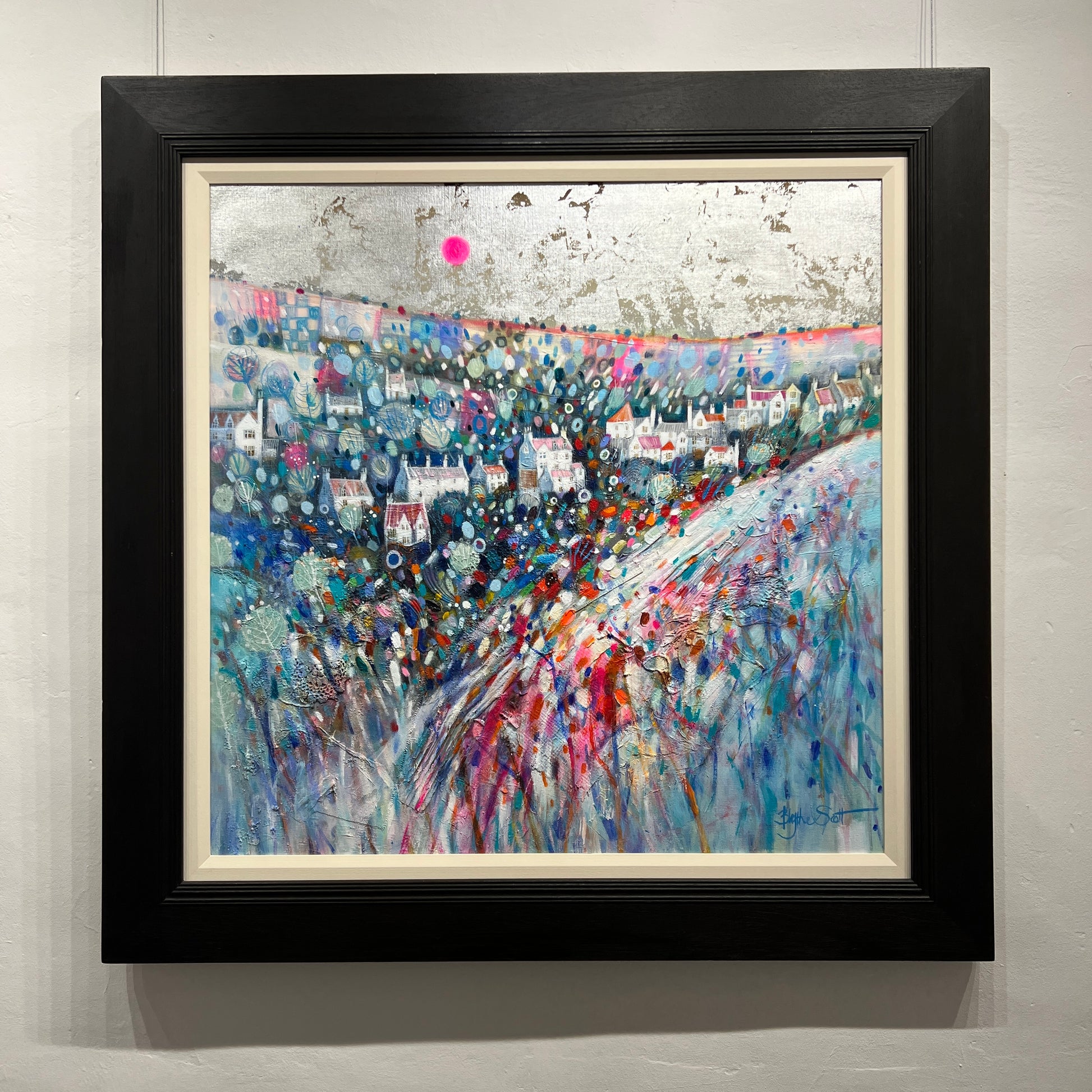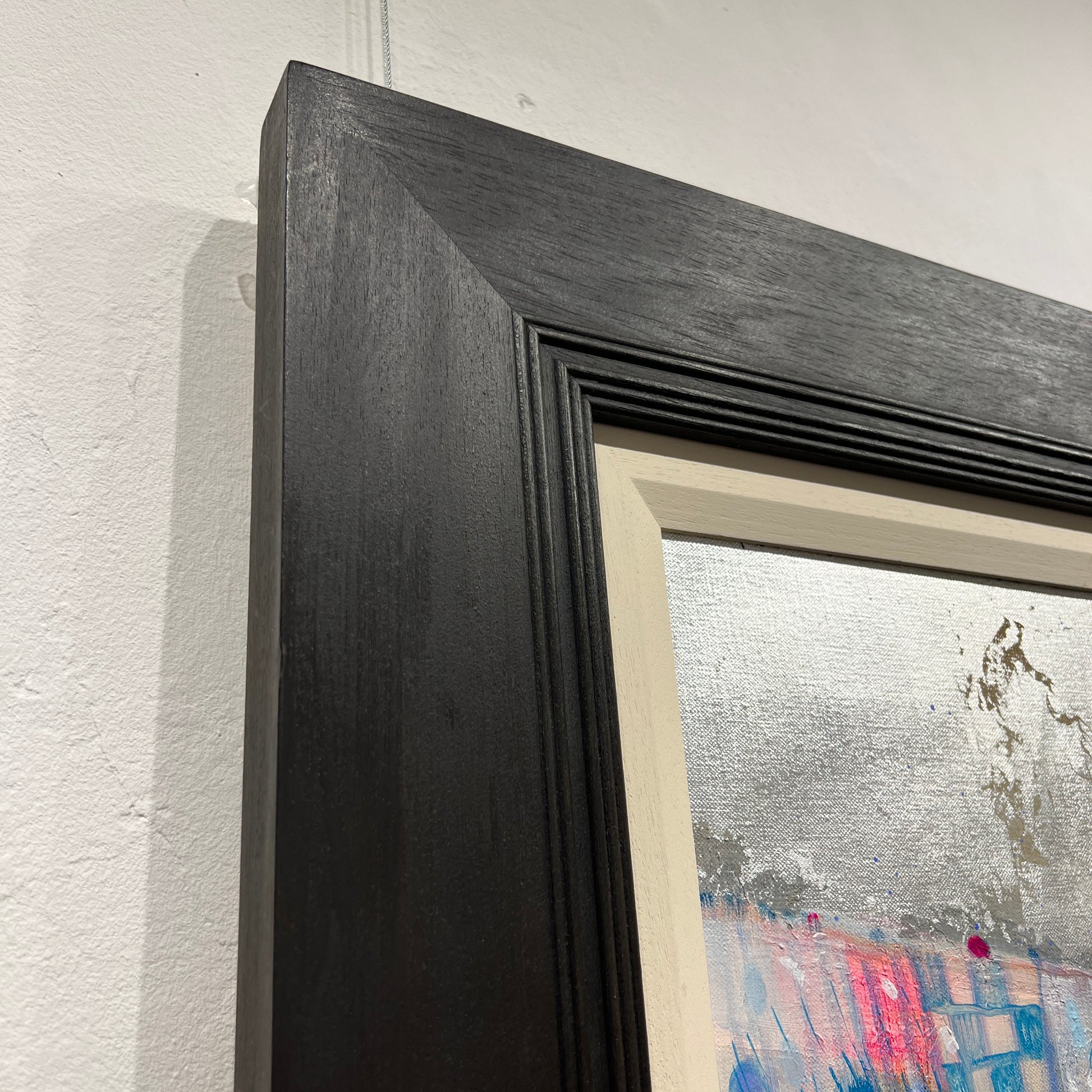 Original acrylic mixed media painting on linen with collage and silver metal leaf. Inspired by the landscape surrounding Melrose in the Scottish Borders. Framed with an ivory slip and a chunky solid wood, off black stained moulding.