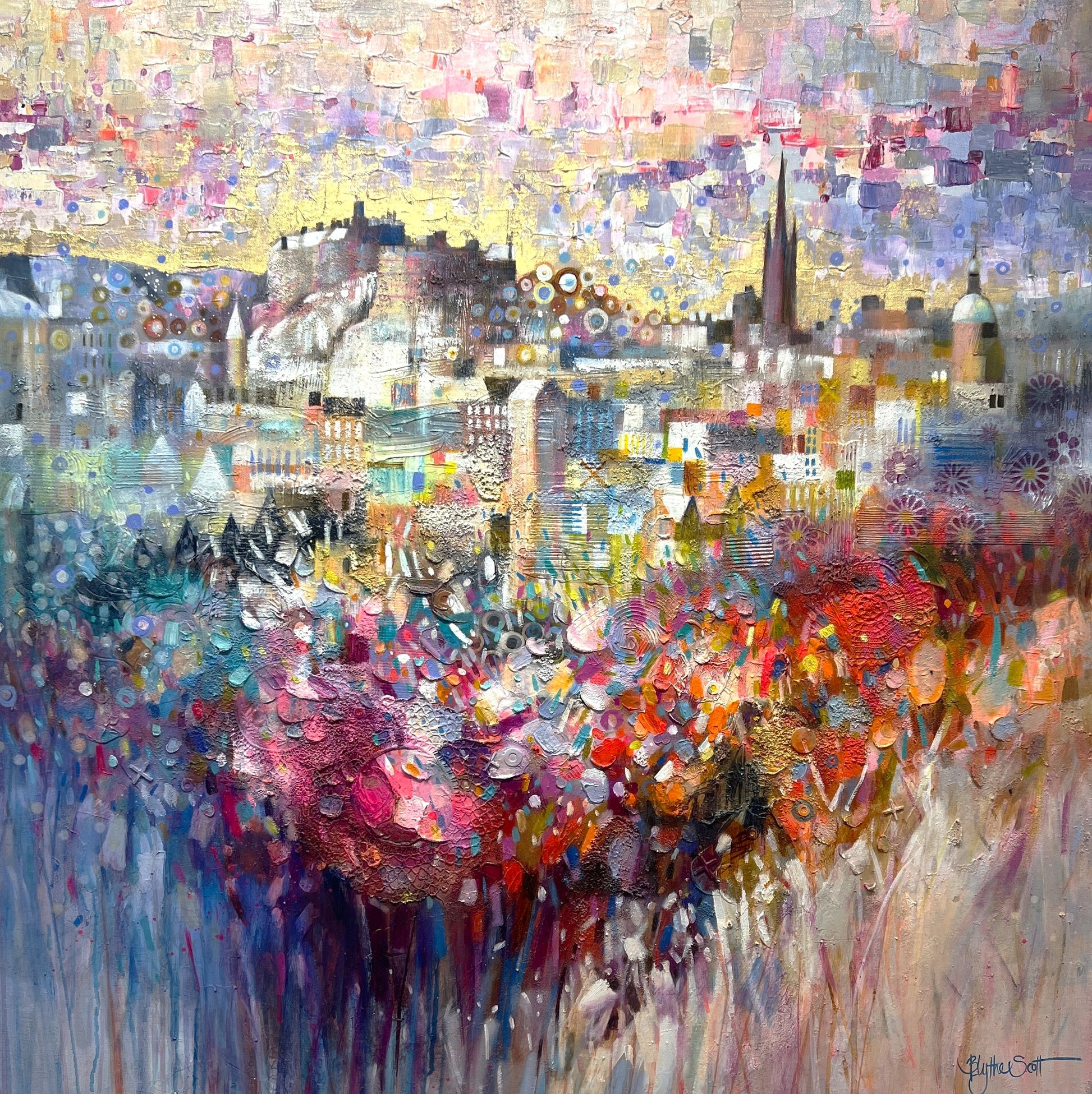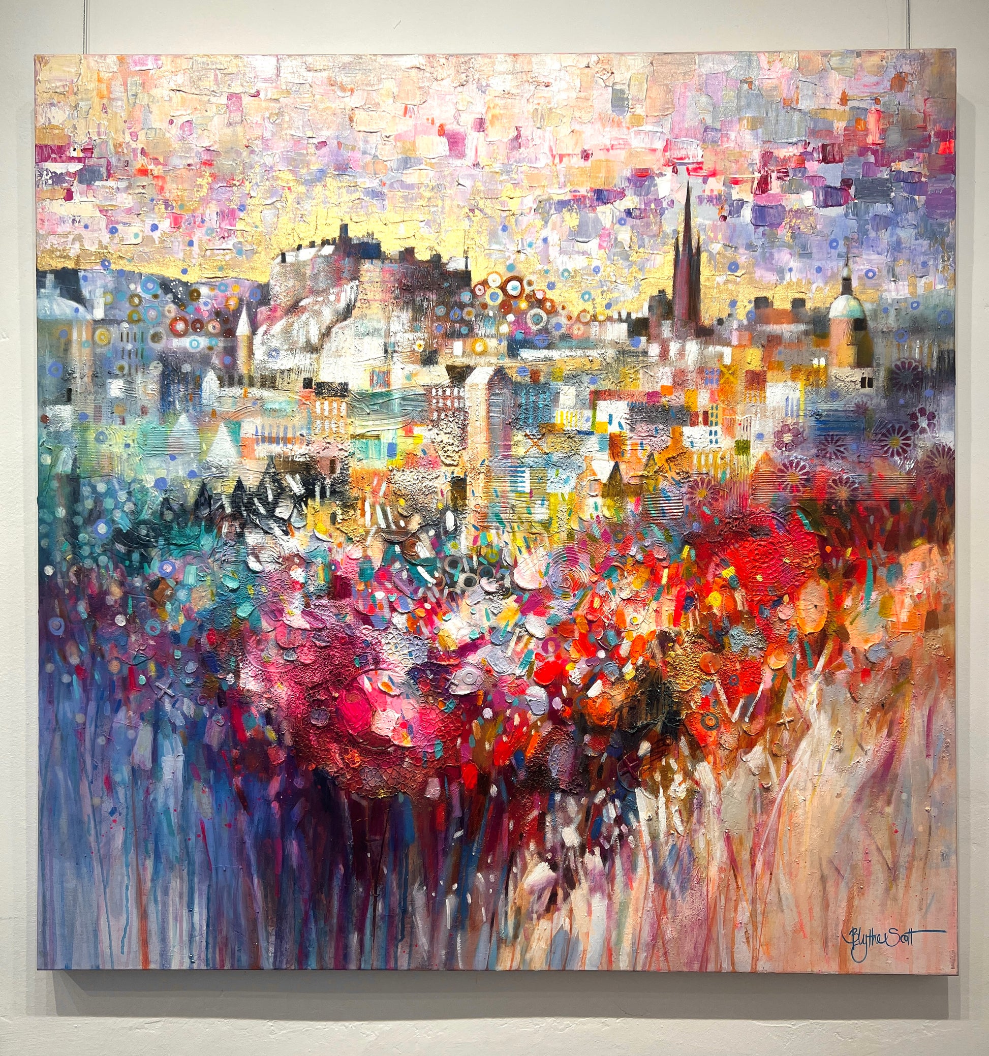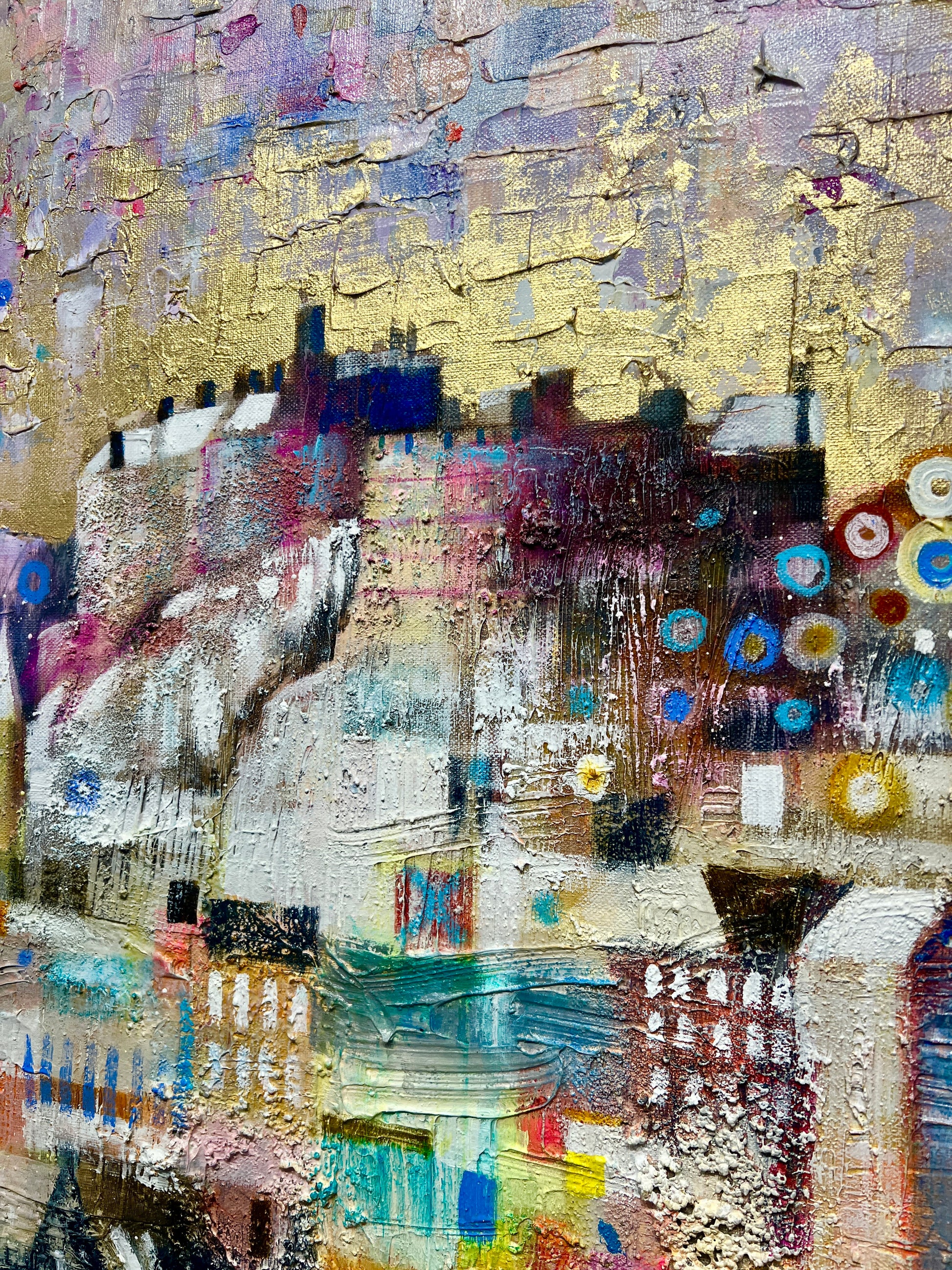 This playful cityscape was inspired by the architecture and landscape of Edinburgh. It measures 44" x 44" ( 112 x 112cm) The artwork has been created on a deep profile linen canvas with sturdy stretcher bars. The surface features a thick and varied application of paint, mixed media and collage materials as well as gold leaf highlights.
