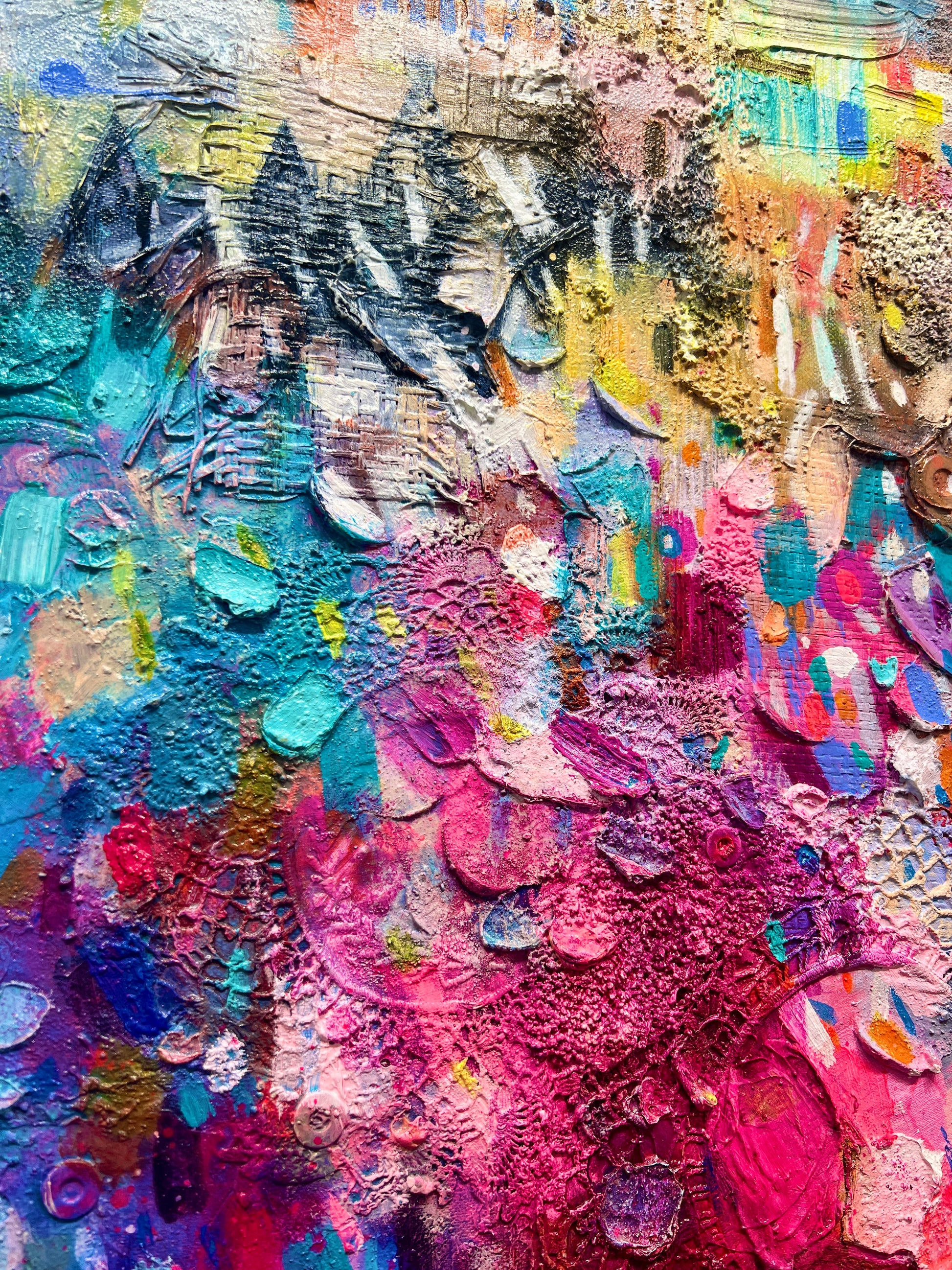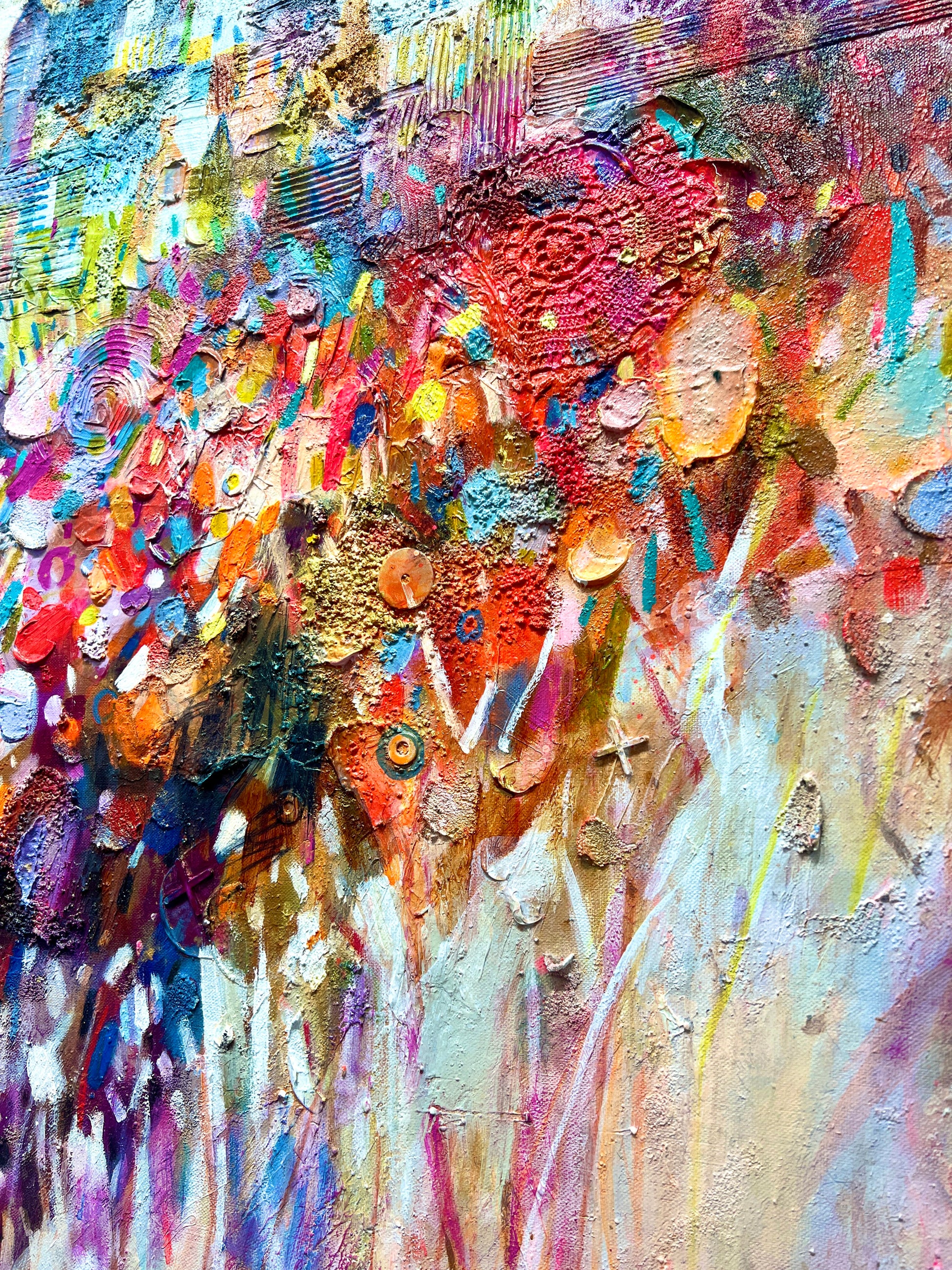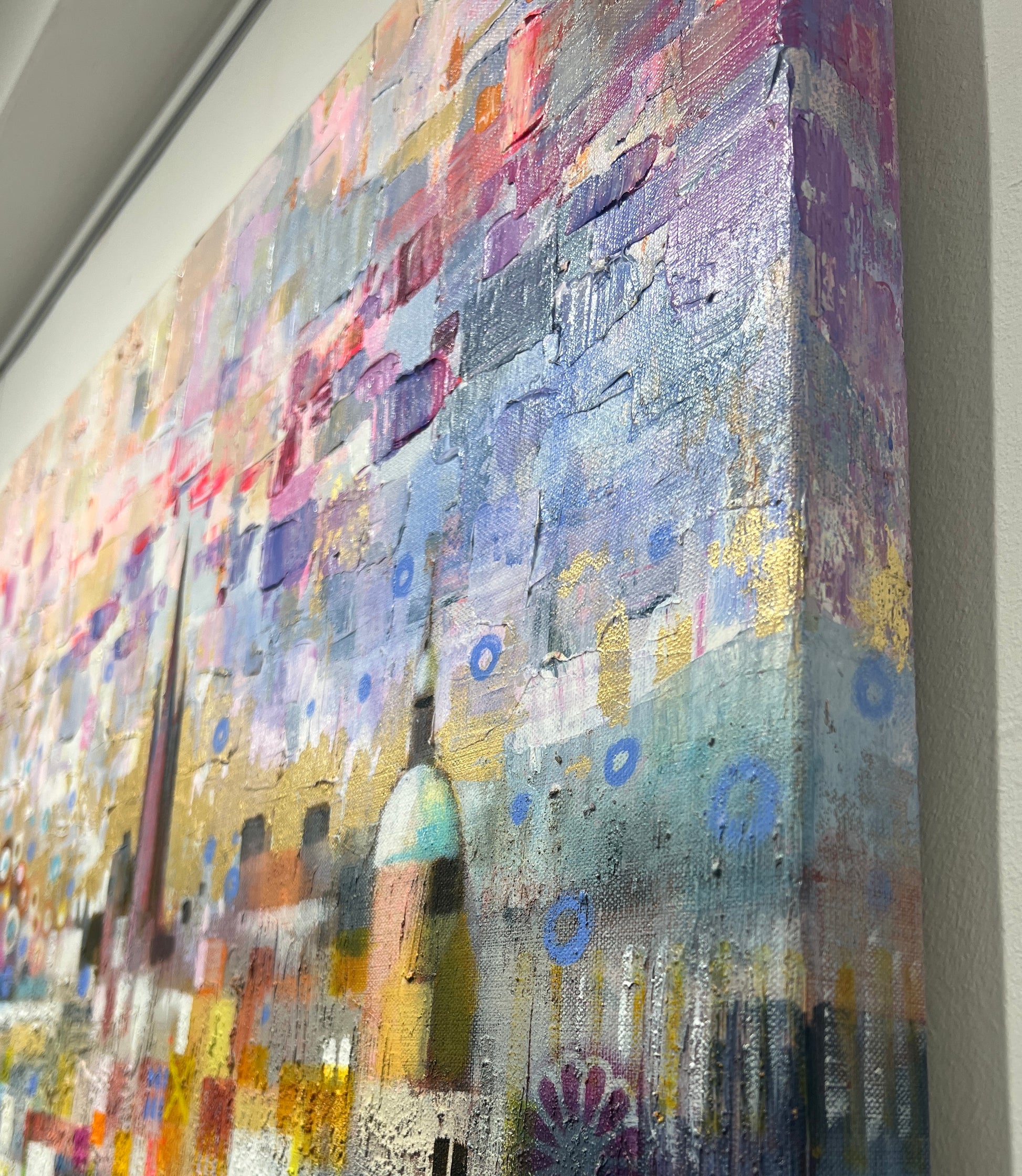 This playful cityscape was inspired by the architecture and landscape of Edinburgh. It measures 44" x 44" ( 112 x 112cm) The artwork has been created on a deep profile linen canvas with sturdy stretcher bars. The surface features a thick and varied application of paint, mixed media and collage materials as well as gold leaf highlights.