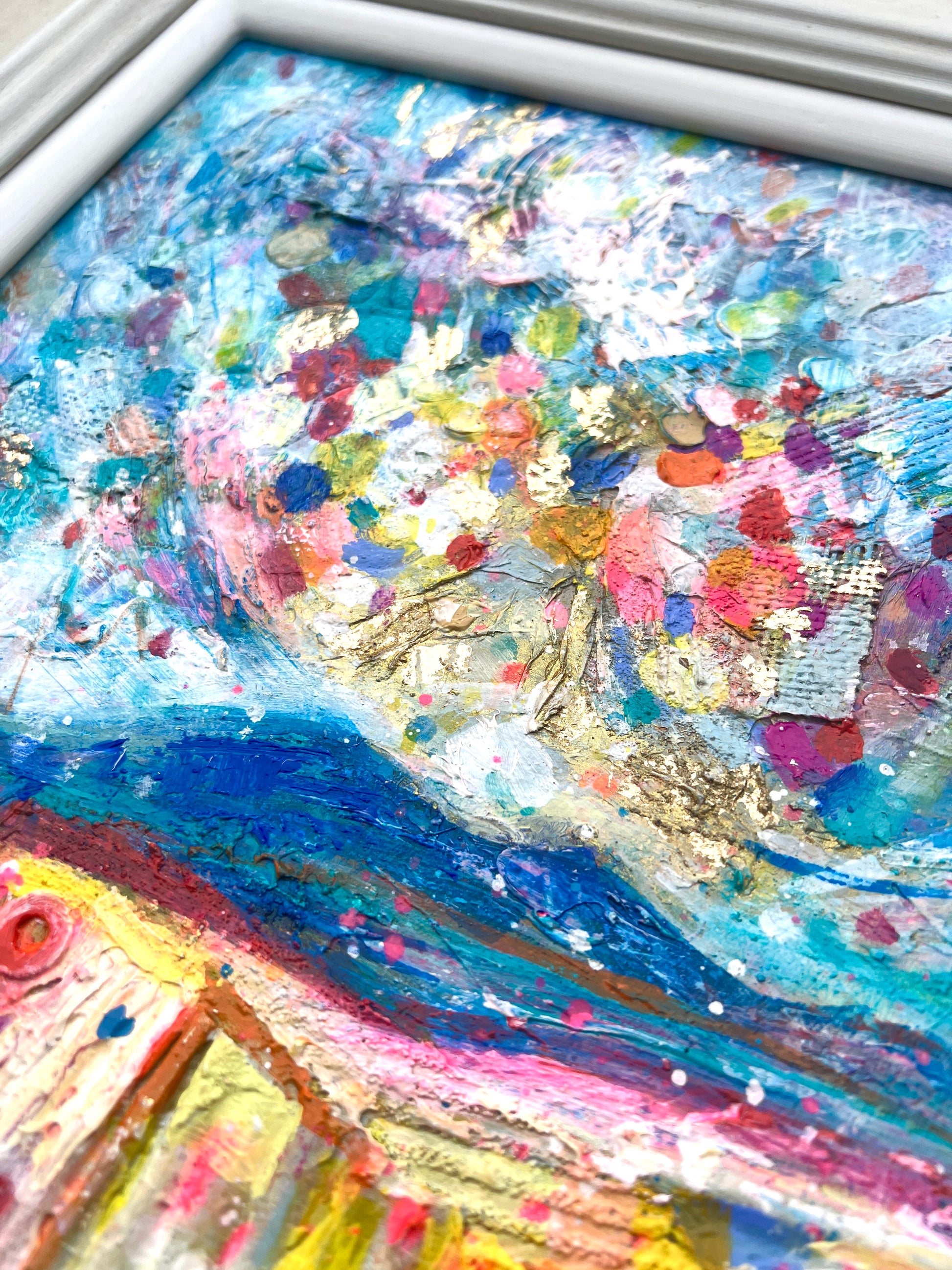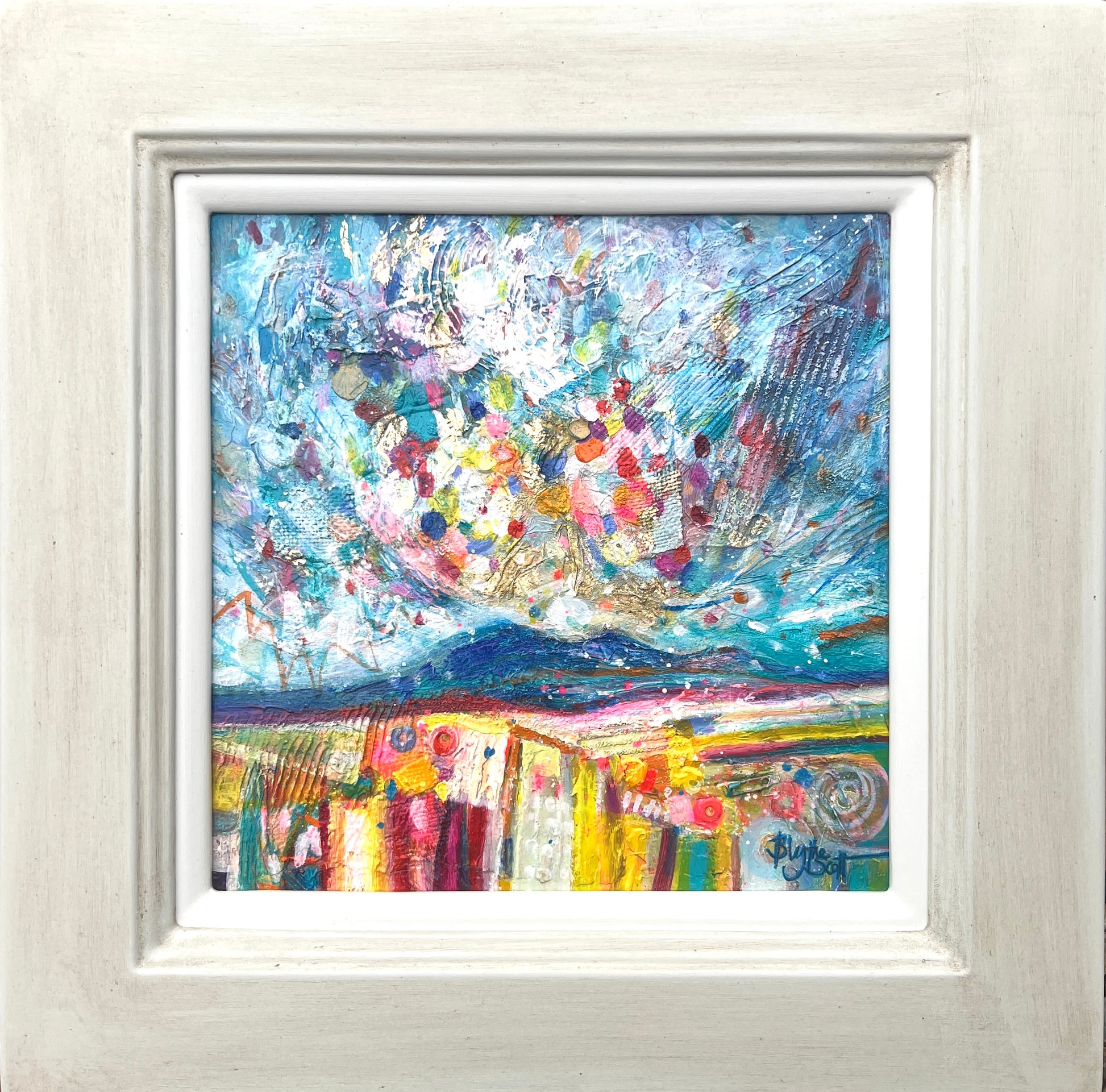 This colourful mixed media painting was inspired by the Eildon Hills in the Scottish Borders. It has been created on 12" x 12" board ( 30 x 30 cm) with layers of collage and gold leaf. It is presented in a solid wood gesso slip and frame with dimensions of 18" x 18" (46 x 46 cm).