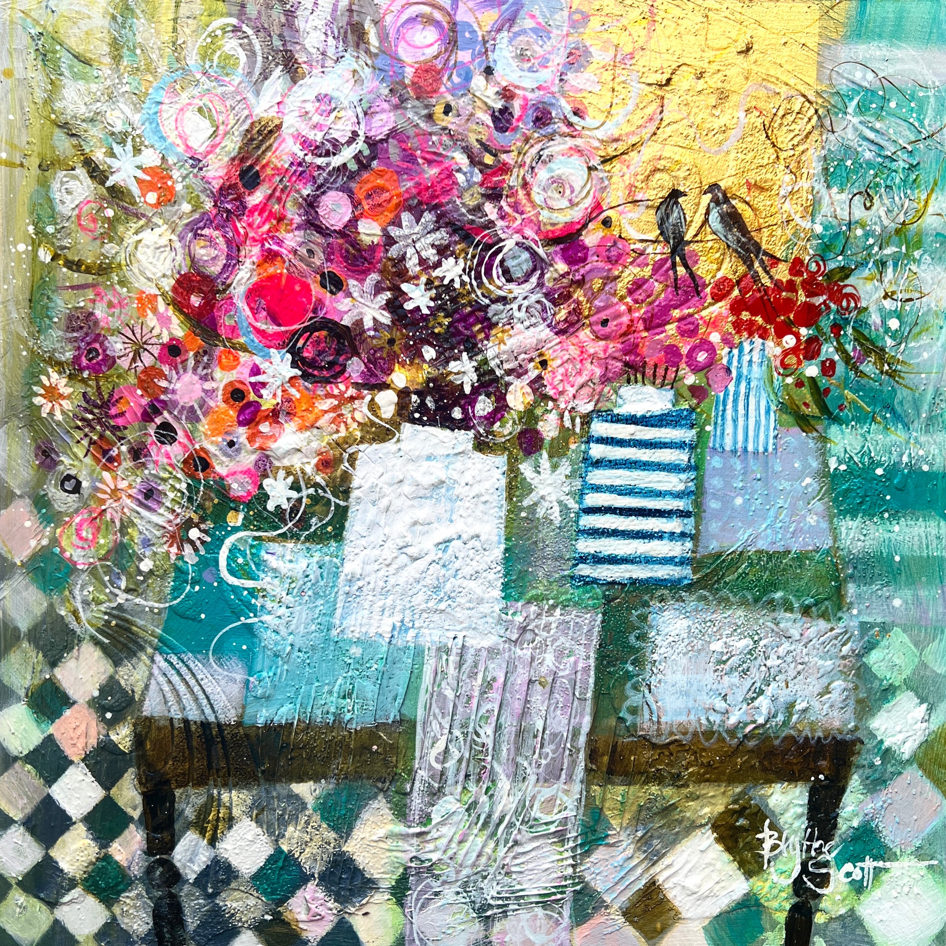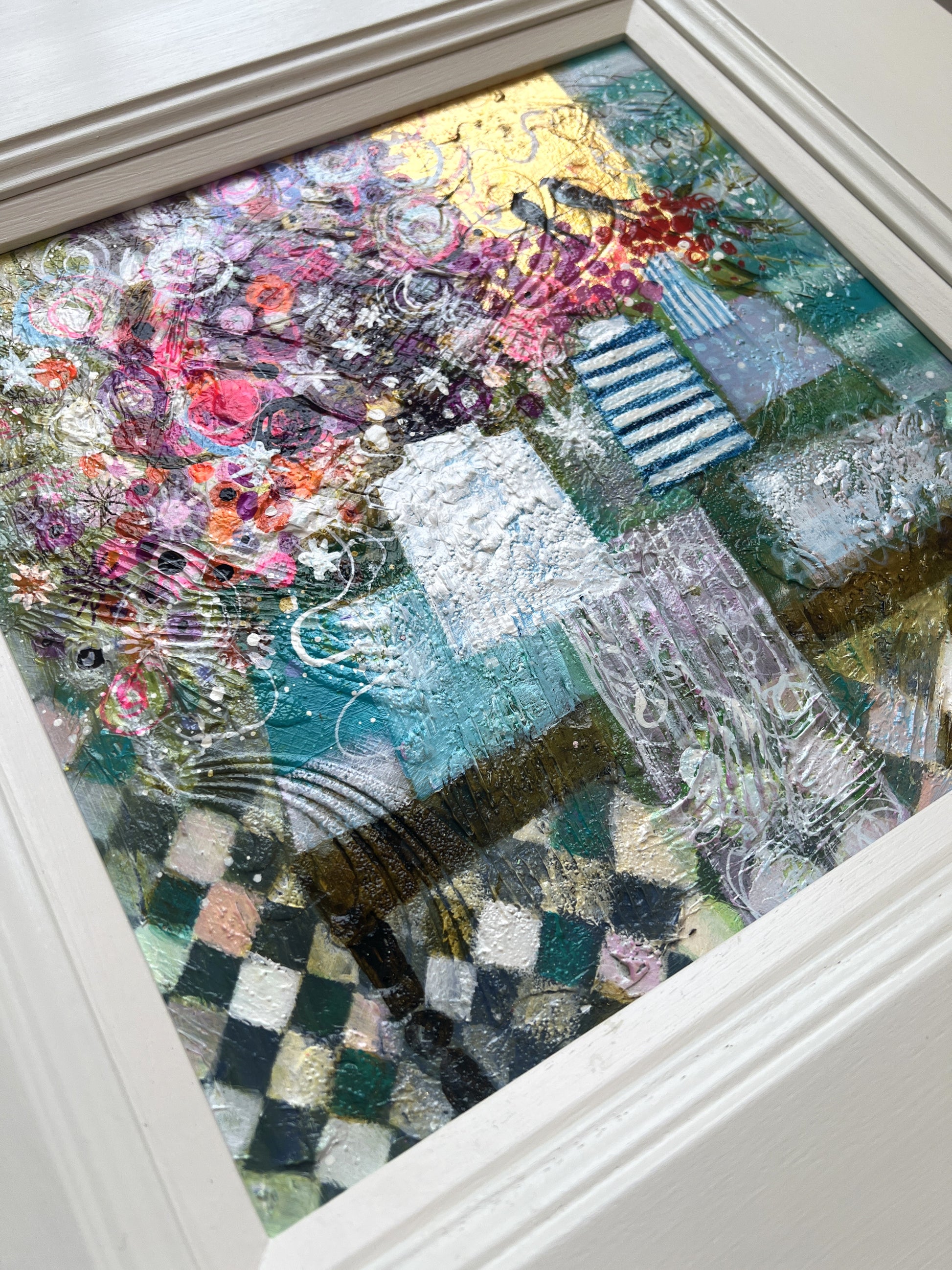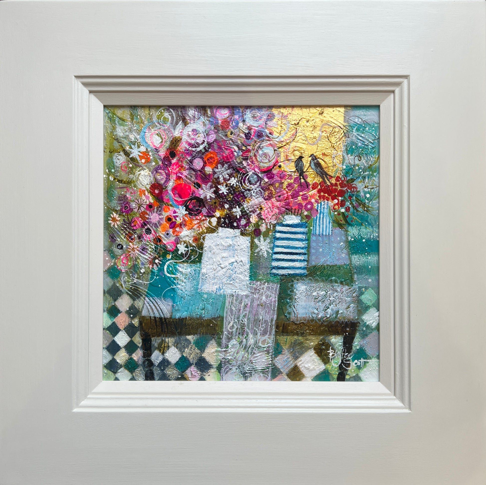 This quirky little still life was inspired by visits to my local flower shop. It has been created on a 30 x 30 cm board with mixed media and 24 carat gold leaf. It is presented in a solid wood frame with slip which have been hand painted and waxed. Framed dimensions are 49 x 49cm.