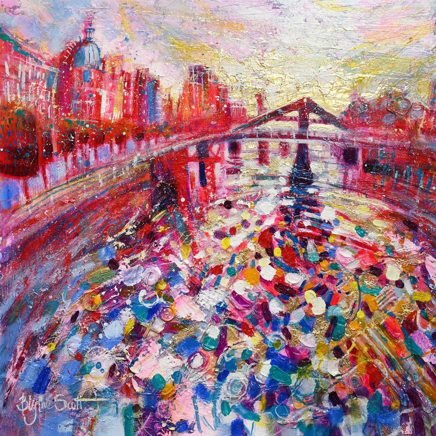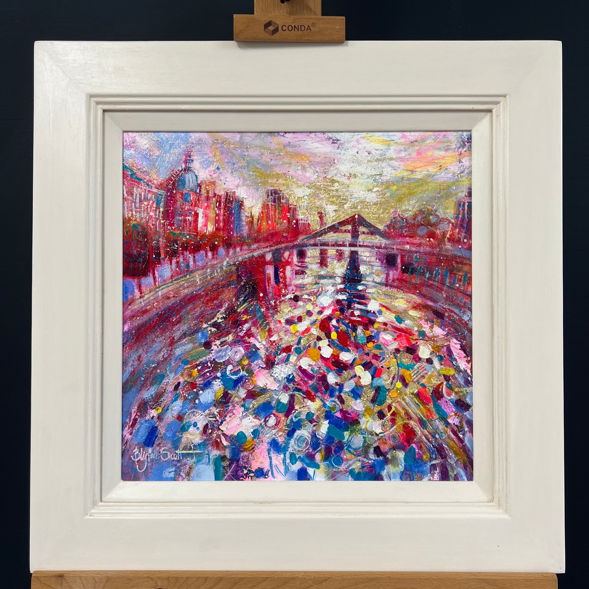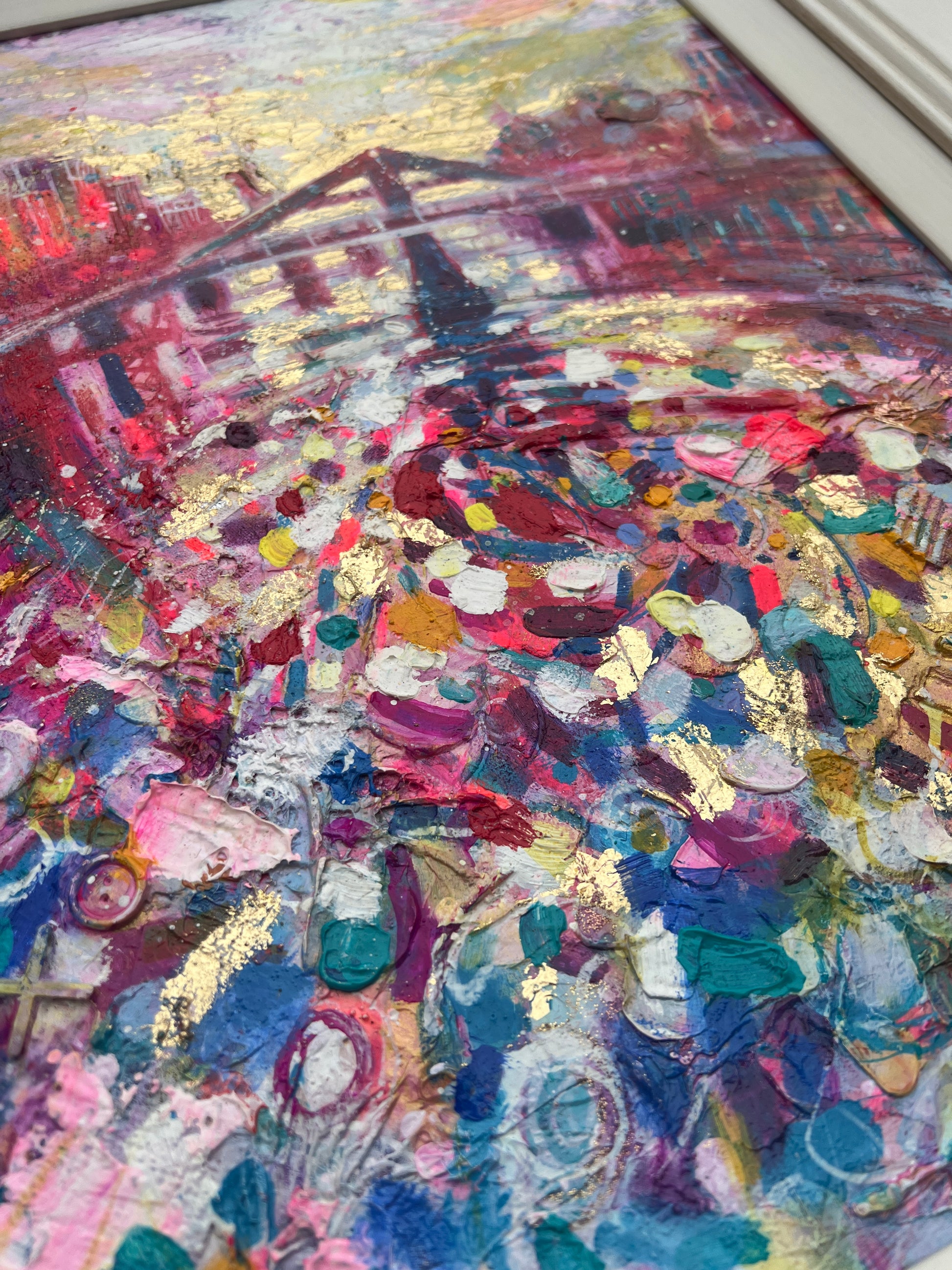 This colourful and textured artwork was inspired by the River Clyde in Glasgow and the Squiggly Bridge that crosses it. It has been created with mixed media and gold leaf on a 16" x 16" board and is framed with an off-white solid wood frame with a gesso and wax finish. The framed dimensions are 23" x 23" (58 x 58 cm).