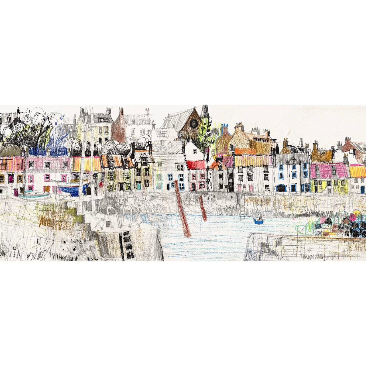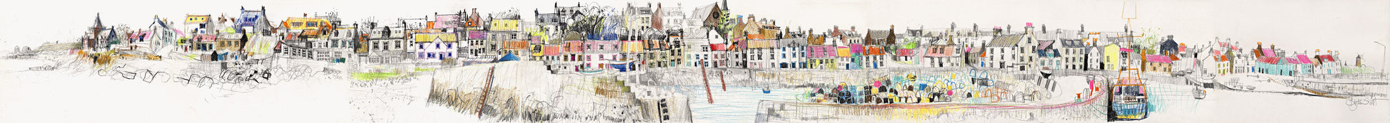 This series of panoramic prints have been developed from enormous sketches that were created in the East Neuk of Fife. The original drawings are up to 6 metres long but all of the prints have been reduced to a length of 120 cm plus borders. Image heights will vary slightly according to the design chosen. They are printed on the best quality smooth, 310 gsm Hahnemuhle etching paper. They can be hung singly, stacked above a bed or sofa or perhaps side by side along a hallway. The prints are open edition and hand stamped and signed by the artist.